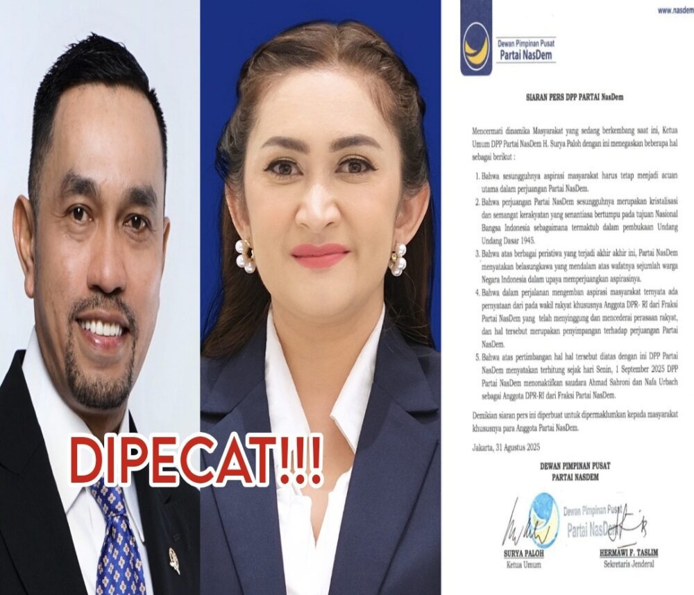 PESAGIRAYA, BANDARLAMPUNG — Ketua Umum Dewan Pimpinan Pusat (DPP)Partai NasDem, melalui siaran Pers DPP Partai Nasdem tertanggal Minggu (30/8/2025) mengumumkan bahwa mencopot Ahmad Sahroni dan Nafa Urbach dari anggota DPR RI fraksi Partai Nasdem. Dalam siaran Pers DPP Partai NasDem, Surya Paloh sebagai Ketua Umum DPP Partai NasDem menegaskan bahwa aspirasi masyarakat harus tetap menjadi acuan utama dalam […]