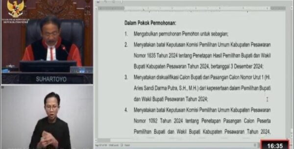 PESAGIRAYA, PESAWARAN — Mahkamah Konstitusi (MK) menggelar sidang putusan terkait dengan Pilkada Kabupaten Pesawaran 2024. Sidang di gelar di Jakarta pada Senin, 24 Februari 2025. Hakim Mahkamah Konstitusi, Ridwan Mansyur dalam pembacaan temuan MK menyatakan secara terang dan jelas Aries Sandi tidak lulus Sekolah Lanjutan Tingkat Atas (SLTA) sederajat. “Nama Aries Sandi tidak ditemukan sebagai […]