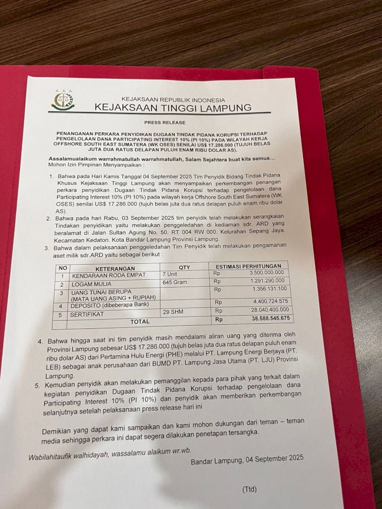 “Sehingga totalnya Rp38.588.545.675,” jelas Aspidsus Kejati Lampung Armen Wijaya, saat konpres Kamis (4/9/2025) malam.